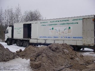 ![]() Suuntaporauksen suorittaja Vaakaporauspalvelu VPP Oy:n kalusto saapuu paikalle. Rekasta löytyvät kaikki toimenpiteessä tarvittavat työkalut ja tarvikkeet.