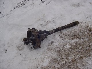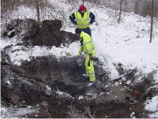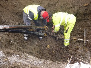 Pora tulee esiin vastarannalta vetäen perässään putkia. Alitus on suoritettu onnistuneesti ja nopeasti. Vesi- ja viemärilinjat ovat valmiit kytkettäväksi joen molemmille puolille jo kaivettuihin linjoihin. Ryhmä voi näin siirtyä seuraavalle alituspaikalle.. Kuvat otti Tapio Nuoritalo |
